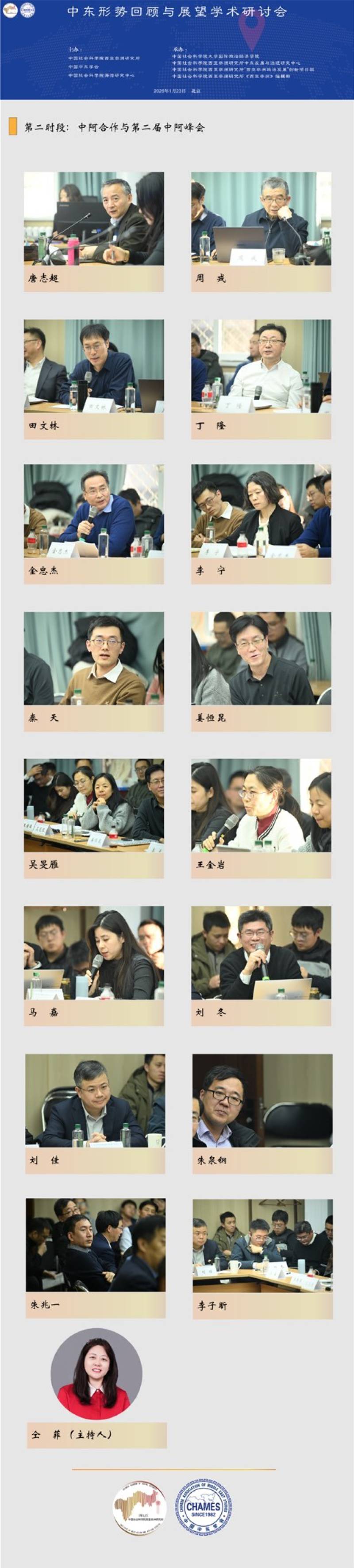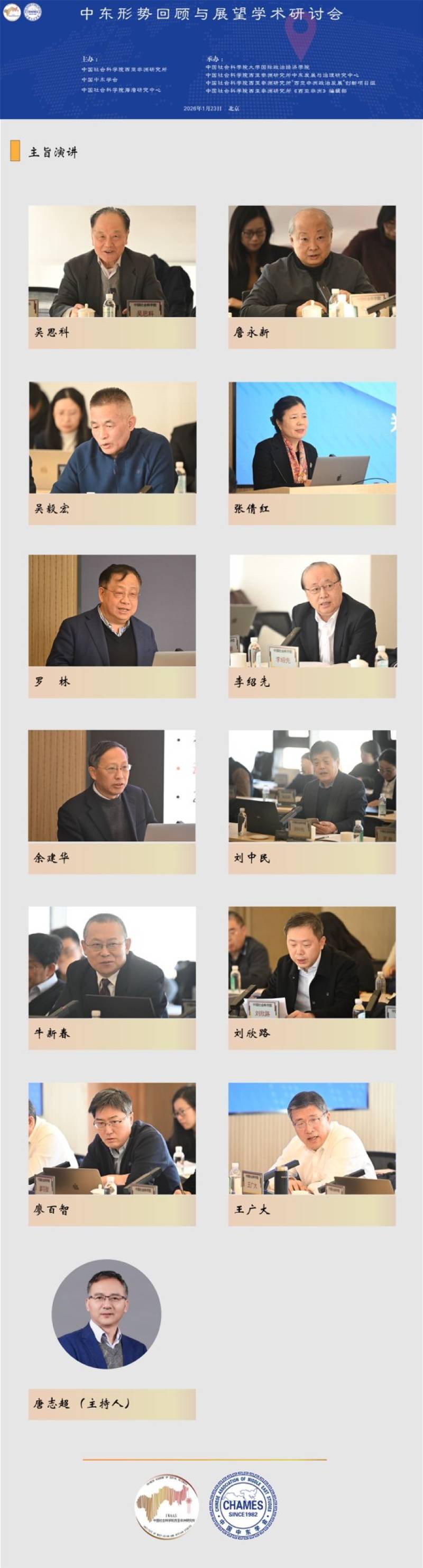 2026年1月23日,“中东形势回顾与展望”学术研讨会在北京隆重举行。中国前中东问题特使吴思科,中国前驻以色列大使詹永新,中国社会科学院西亚非洲研究所党委书记周工岱,中国社会科学院西亚非洲研究所所长、中国非洲研究院院长叶海林以及来自全国各高校和研究机构的60余位专家出席了会议。中国中东学会会长、中国社会科学院海湾研究中心主任王林聪主持开幕式。