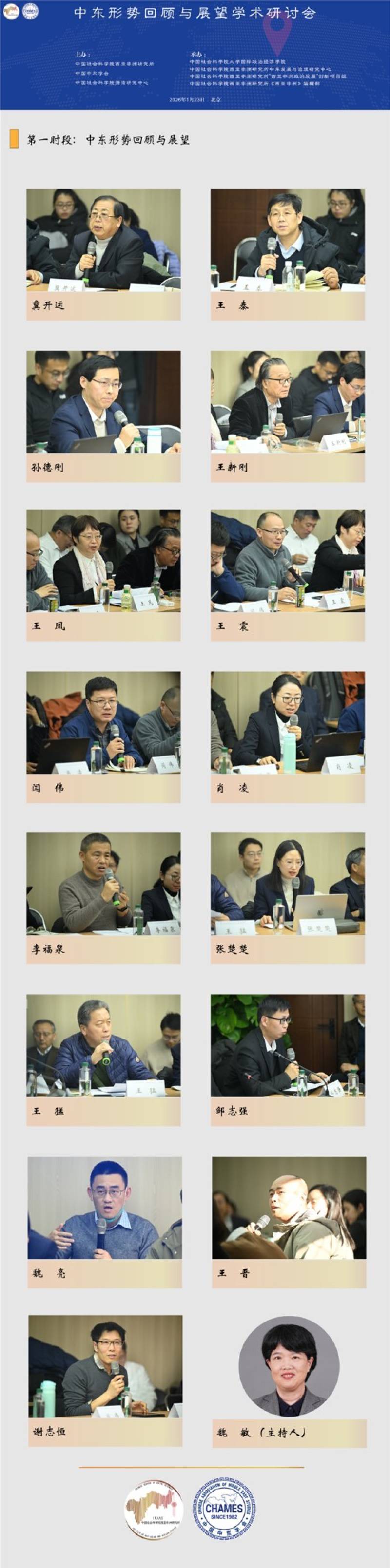 2026年1月23日,“中东形势回顾与展望”学术研讨会在北京隆重举行。中国前中东问题特使吴思科,中国前驻以色列大使詹永新,中国社会科学院西亚非洲研究所党委书记周工岱,中国社会科学院西亚非洲研究所所长、中国非洲研究院院长叶海林以及来自全国各高校和研究机构的60余位专家出席了会议。中国中东学会会长、中国社会科学院海湾研究中心主任王林聪主持开幕式。